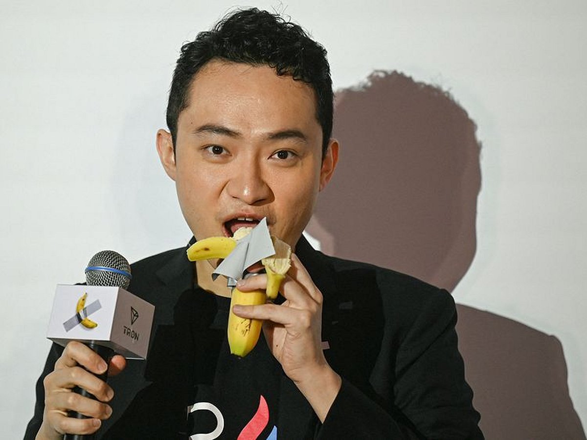 Chinese-born crypto founder Justin Sun eats a banana artwork consisting of a fresh banana taped to a wall in Hong Kong on Nov. 29, 2024, after buying Italian artist Maurizio Cattelan’s provocative conceptual art piece at an auction in New York for $6.2 million. AFP