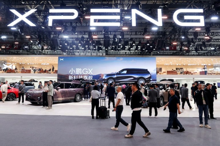 Visitors walk past the booth of Chinese automaker XPeng at the Beijing Auto Show – Copyright CN-STR/AFP –