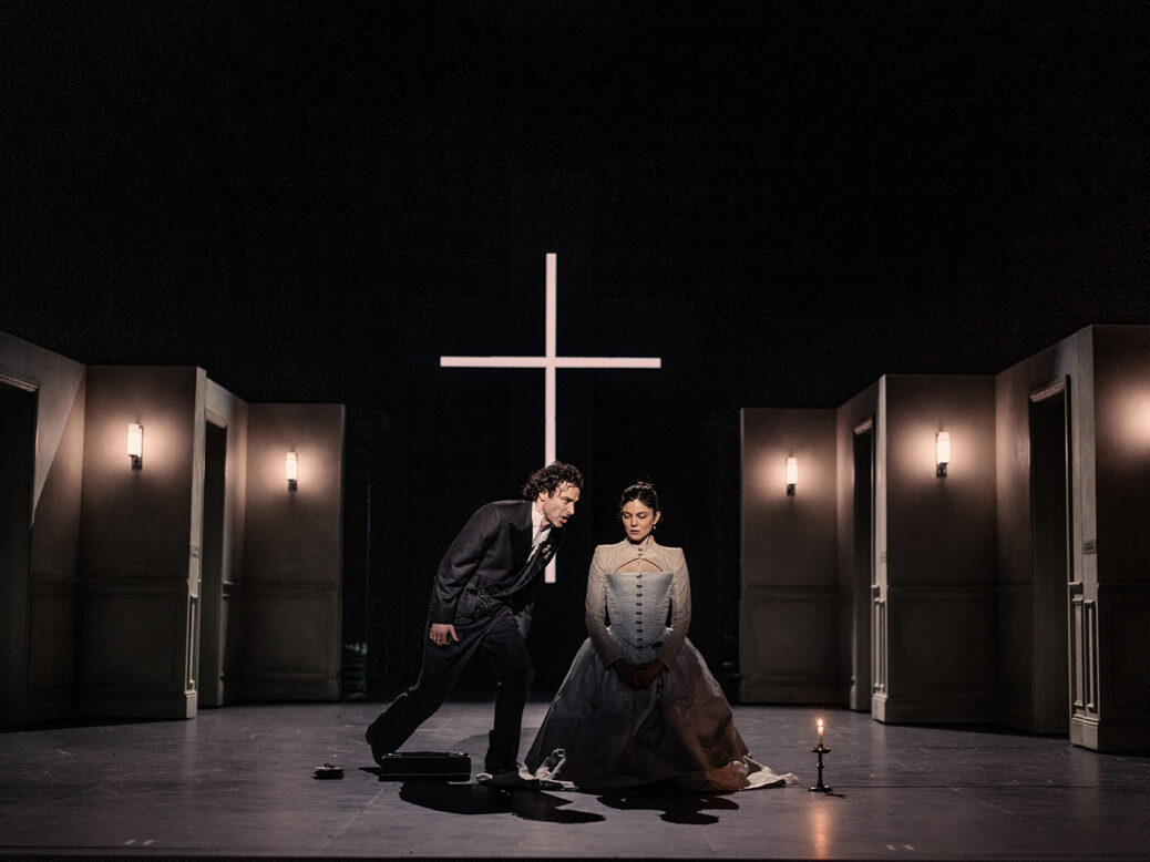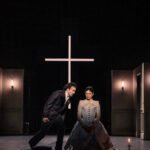 Christopher Hampton returns here to his 1985 play (he also wrote the screenplay for the 1998 Stephen Frears film adaptation starring John Malkovich and Michelle Pfeiffer) and sets it in a timeline of its own, drawing inspiration from the aesthetic of pre-revolutionary France, but with a sharp, metallic modernity. The walls turned into hidden doors are lined with mirrors that reflect not only the actors, but also the audience itself. As was sometimes the case in Laclos’s 18th-century Paris, the mirrors are crowned with rococo paintings of women in various stages of undress, though delicate pastels are washed out in shades of gray and white. Rosanna Vize’s set design, combined with Natalie Roar’s costumes, manage to be both exquisitely ornate yet have a gritty contemporary minimalism.