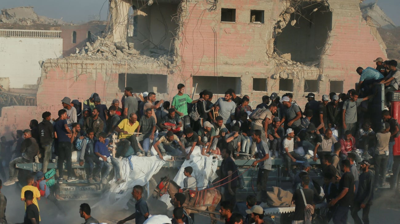 Palestinians carry bags of flour along al-Rashid Street in western Jabalia, Gaza Strip, on June 17, 2025, following reports of humanitarian aid trucks entering the northern Gaza Strip through the Israeli-controlled Zikim crossing during the ongoing Israeli-Palestinian conflict. (Youssef Alzanoun / Middle East Images via AFP)